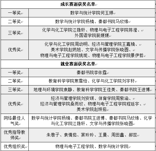 经过激烈角逐,两赛道共评选出一等奖2名,二等奖4名,三等奖6名,优秀奖11名,网络最佳人气奖5名,优秀指导教师6名、优秀组织奖2个。